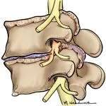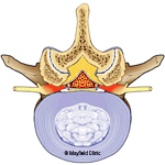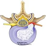 A herniated disc occurs when the gel-like center of a disc ruptures through a weak area in the tough outer wall. Back or leg pain, numbness or tingling may result when the disc material compresses a spinal nerve. Treatment with medication, spinal injections, and physical therapy is the first step to recovery. Most people improve in 6 weeks and return to normal activity. If symptoms continue, surgery may be an option.